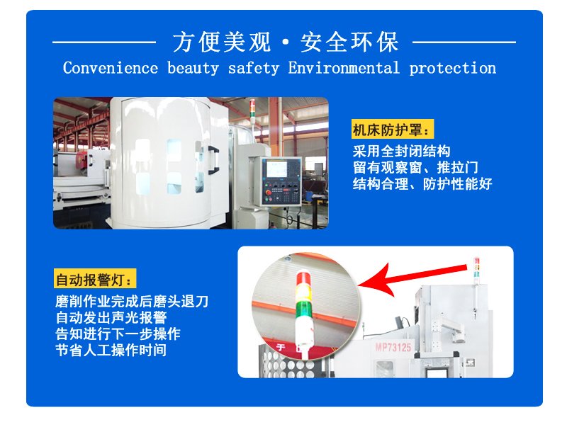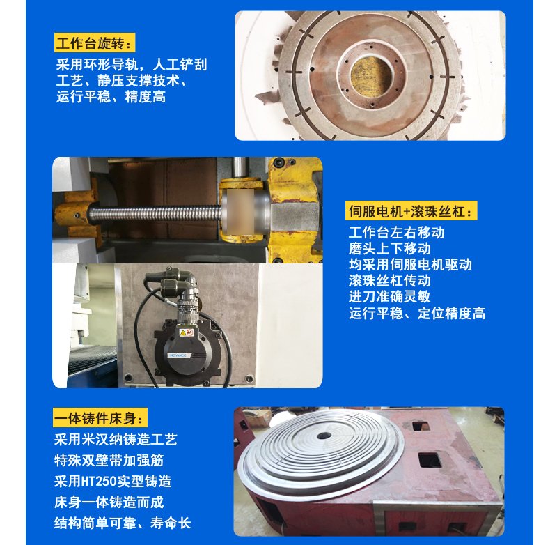 產品說明:MP7363A高(gao)(gao)精臥軸圓臺平(ping)面磨床,采用(yong)工(gong)(gong)(gong)作臺在床身圓導軌(gui)上固定旋轉,雙立柱橫(heng)梁, 拖板(ban)在橫(heng)梁上做縱向往復移動(dong), 磨頭沿(yan)拖板(ban)垂(chui)直移動(dong)進給布局型式,整體結構穩重緊湊,精度(du)高(gao)(gao)性能(neng)可靠(kao)、制(zhi)造工(gong)(gong)(gong)藝性好、操作使用(yong)方便(bian)、采用(yong)砂輪周(zhou)邊磨削,工(gong)(gong)(gong)件上下兩(liang)平(ping)面可獲得要求較高(gao)(gao)的平(ping)行度(du),尺寸(cun)精度(du)和工(gong)(gong)(gong)件表面粗(cu)糙度(du)。